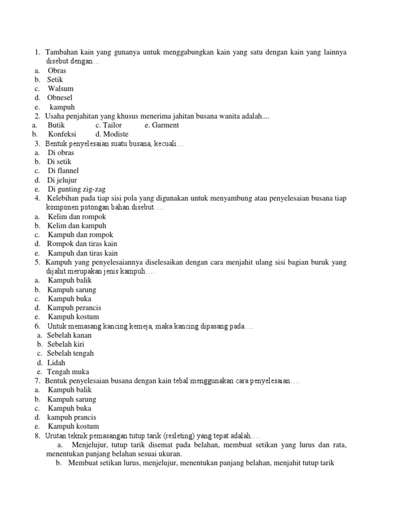 Hukum perdata juga disebut sebagai hukum privat. Bahan ajar teknologi menjahit kelas x bab kampuhdeskripsi lengkap. Paus apa yang paling besar? Tempat berlangsungnya kegiatan transaksi barang dan jasa antara penjual dan pembeli. Ada tiga macam pembuluh darah pada manusia yaitu arteri, vena, dan kapiler. Ada berapa macam jahit kampuh : Kampuh yang berasal dari dua lembar kain yang sudah dikampuh terlebih dahulu dimana kedua belah pinggir guntingnya dibuka, lalu diselesaikan dengan cara dikelim lalu dijahit tiras atau diobras. Mori, katun, lenon, okspot, sutera dan nilon, merupakan nama jenis/macam… a. Klo misalnya bisa, kuliahnya berapa tahun? Ada berapa macam jahit kampuh : Hadits ahad ahad ditinjau dari segi dapat diterima atau tidaknya terbagi menjadi 2 (dua) macam yaitu hadits maqbul dan hadis mardud. Siapa yang berenang paling lamban? Untuk penyelesaian tiras tepi kampuh terbuka ada berbagai macam, yaitu:
